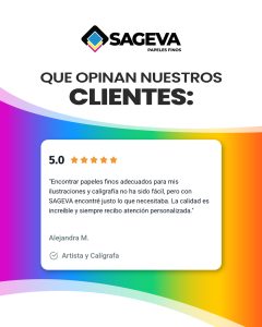 Diseñadores, imprentas y artistas han encontrado en SAGEVA un aliado confiable. La calidad de los papeles permite lograr impresiones nítidas, colores vibrantes y una identidad visual sólida. Cada testimonio confirma que la atención personalizada y la excelencia del material convierten cada proyecto en una pieza memorable.